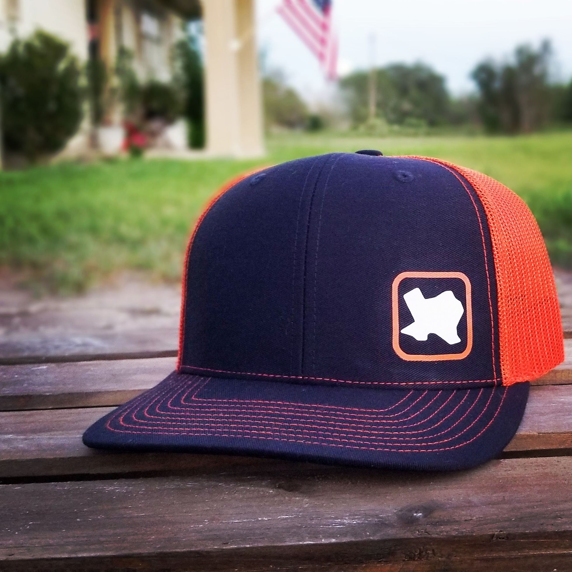 navy/orange Richardson 112 snap back with orange/white HD heat press decal