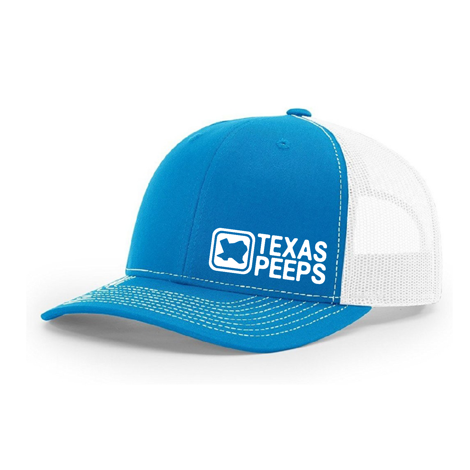 aqua/white richardson 112 snap back cap with white Texas Peeps Label decal