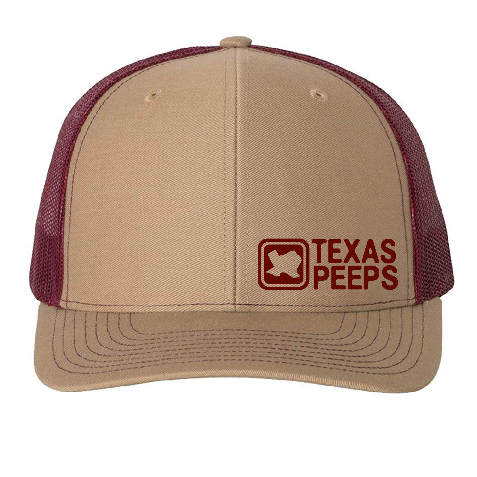khaki/burgundy richardson 112 snap back cap with burgundy Texas Peeps Label decal