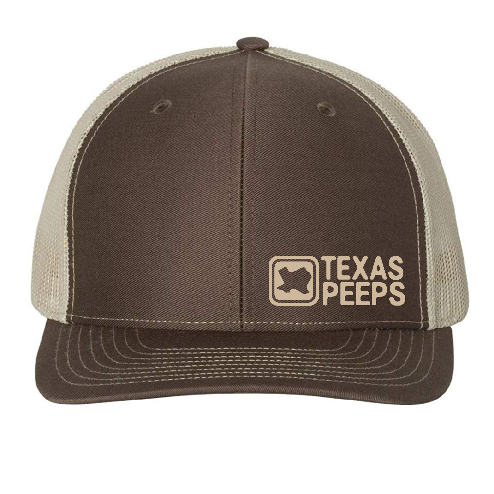 brown/khaki richardson 112 snap back cap with khaki Texas Peeps Label decal