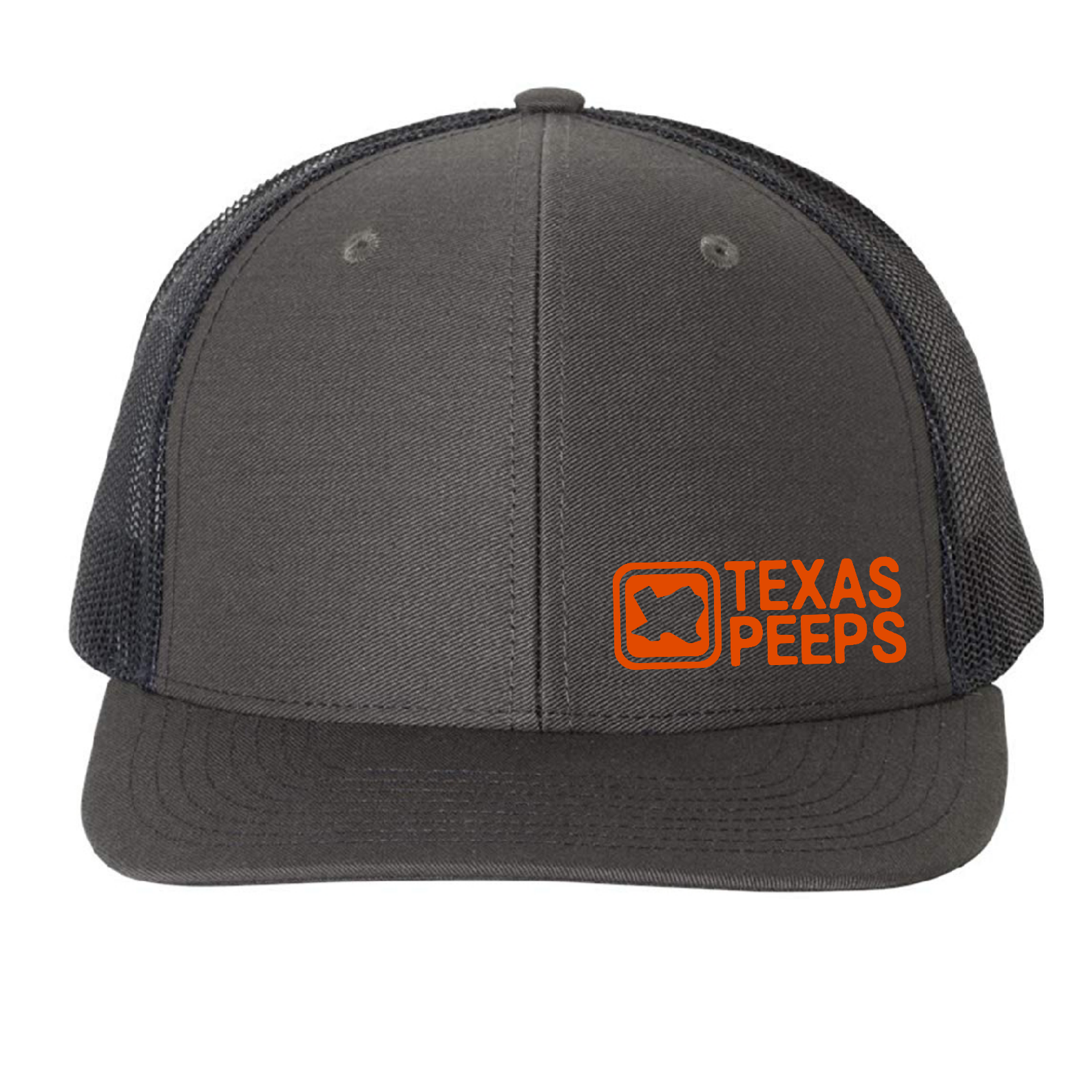 charcoal/black richardson 112 snap back cap with orange Texas Peeps Label decal